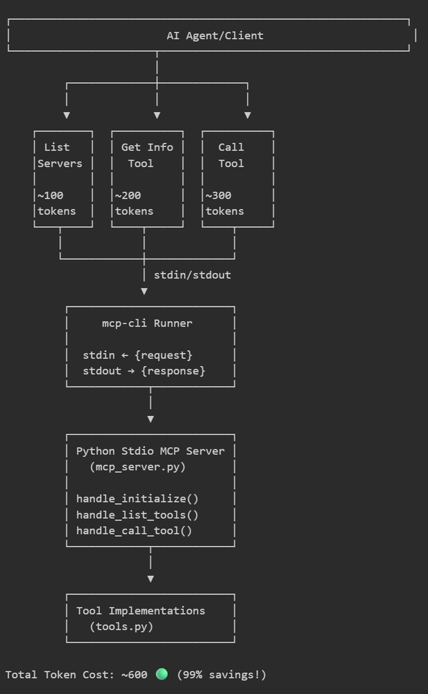AI Agent Says: "What servers exist?" ↓ mcp-cli responds AI Agent Says: "What are the params for tool X?" ↓ mcp-cli responds AI Agent Says: "Execute tool X" mcp-cli executes and responds