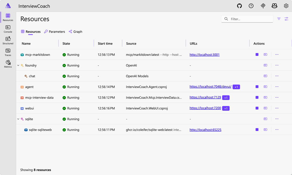 Aspire 대시보드를 열고, 모든 서비스가 Running으로 표시될 때까지 기다린 후, WebUI 엔드포인트를 클릭하여 모의 면접을 시작하세요.