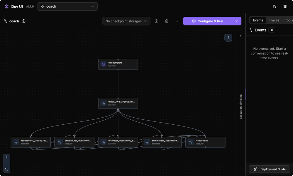 git clone https://github.com/Azure-Samples/interview-coach-agent-framework.git cd interview-coach-agent-framework # 자격 증명 구성 dotnet user-secrets --file ./apphost.cs set MicrosoftFoundry:Project:Endpoint "<your-endpoint>" dotnet user-secrets --file ./apphost.cs set MicrosoftFoundry:Project:ApiKey "<your-key>" # 모든 서비스 시작 aspire run --file ./apphost.cs