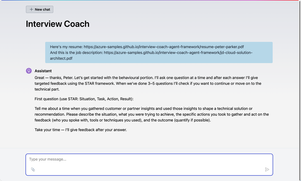그래서 준비했습니다! Microsoft Agent Framework과 Microsoft Foundry, MCP(Model Context Protocol), Aspire등을 어떻게 프로덕션 상황에서 조합할 수 있는지를 보여주는 오픈소스 Interview Coach 샘플입니다. AI 코치가 인성 면접 질문과 기술 면접 질문을 안내한 후, 요약을 제공하는 효율적인 면접 시뮬레이터입니다.