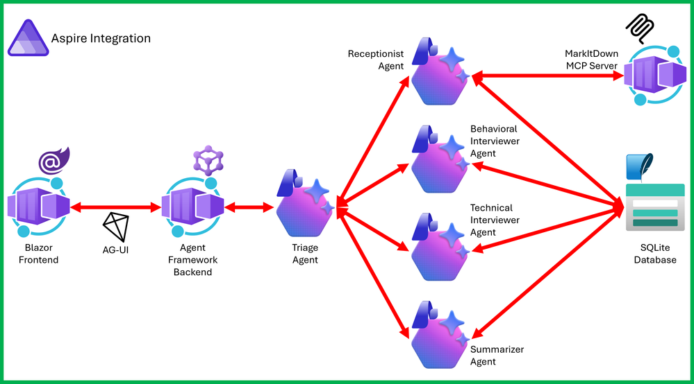 - 에이전트. Microsoft Agent Framework로 구축된 면접 로직.