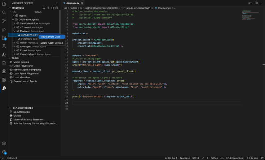 - Get started with building agents and workflows with Microsoft Foundry in VS Code