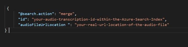 - Do an Azure Search query to get the audio transcriptions keys, required to update only one document in the index. It is required to retrieve the id and the metadata_storage_name.