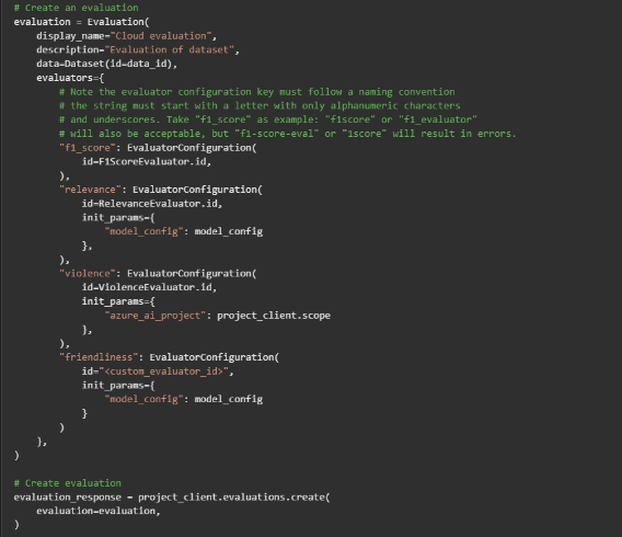We now offer cloud-based evaluations to help you scale assessments on large production datasets. You can remotely initiate a job with our Azure AI Evaluation service, which will run the evaluations and return the results once they are complete. This experience is available with the Azure AI Foundry Python SDK.