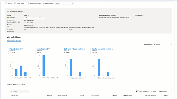 Metric dashboard and detailed metric results for image evaluation in Azure AI Foundry.Azure AI Foundry Evaluations SDK & UI