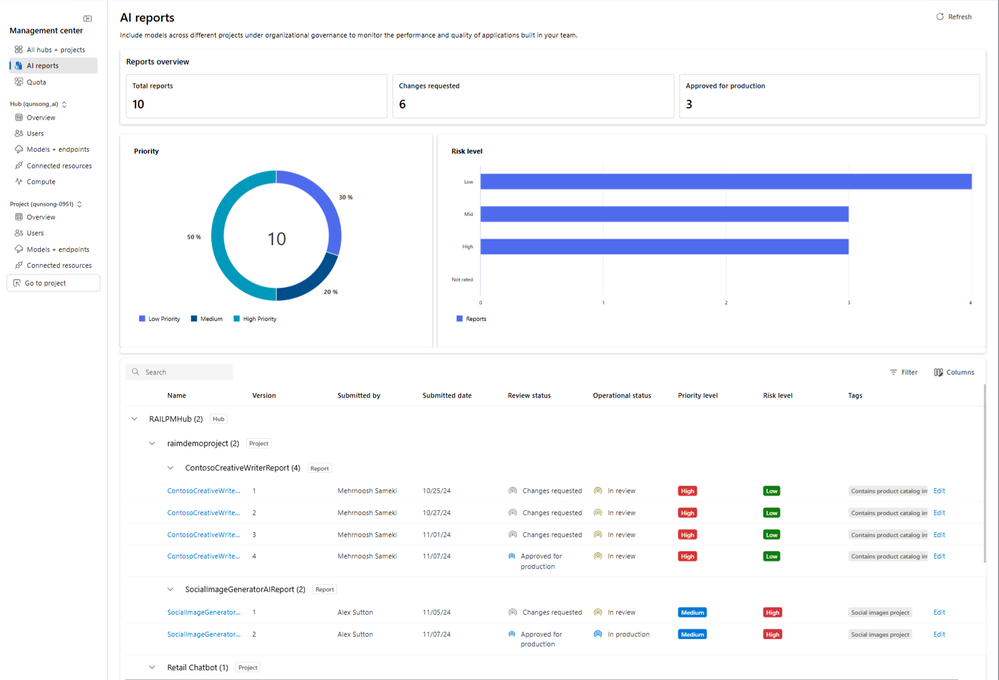 Developers can soon compile key project details, including business use case, potential risks, model card, endpoint configuration, content safety settings, and evaluation results into a unified AI report. These reports can be published to the Azure AI Foundry portal's management center for business leaders to track, review, and assess. Additionally, users can export AI reports in PDF and SPDX 3.0 AI BOM formats for integration into GRC workflows. These reports help determine if an AI model or application is ready for production as part of AI impact assessments.