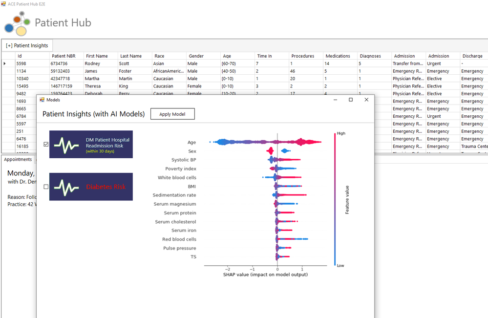 As illustrated below, Patient Hub: Doctor Portal could enable the doctor to apply Patient Insights to the entire patient cohort by selecting the Patient Hospital Readmission Risk ML model. Also, before the model is applied we display the SHAP values that impact the model output (E.g Age, White blood cells etc.) so the doctor could quickly analyze the model and evaluate it before applying it.