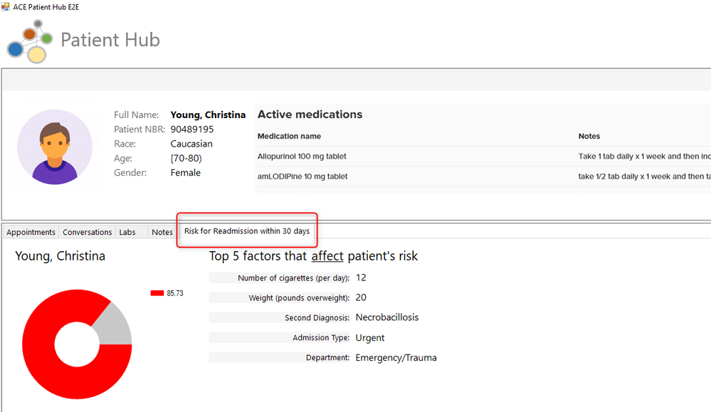 Consider a patient’s desire to know their risk for re-admission. The following screenshots show how a potential patient (Christina Young) could interact with the Patient Hub’s Patient Portal. Note how the “Risk for Re-admission within 30 days” tab displays the patient’s risk as well as the top 5 parameters that affect that score. This view is useful to the patient because they can see the areas they can talk with their doctors about and can change to improve their own care. Model explainability and how we derive these will be covered in a detailed post.