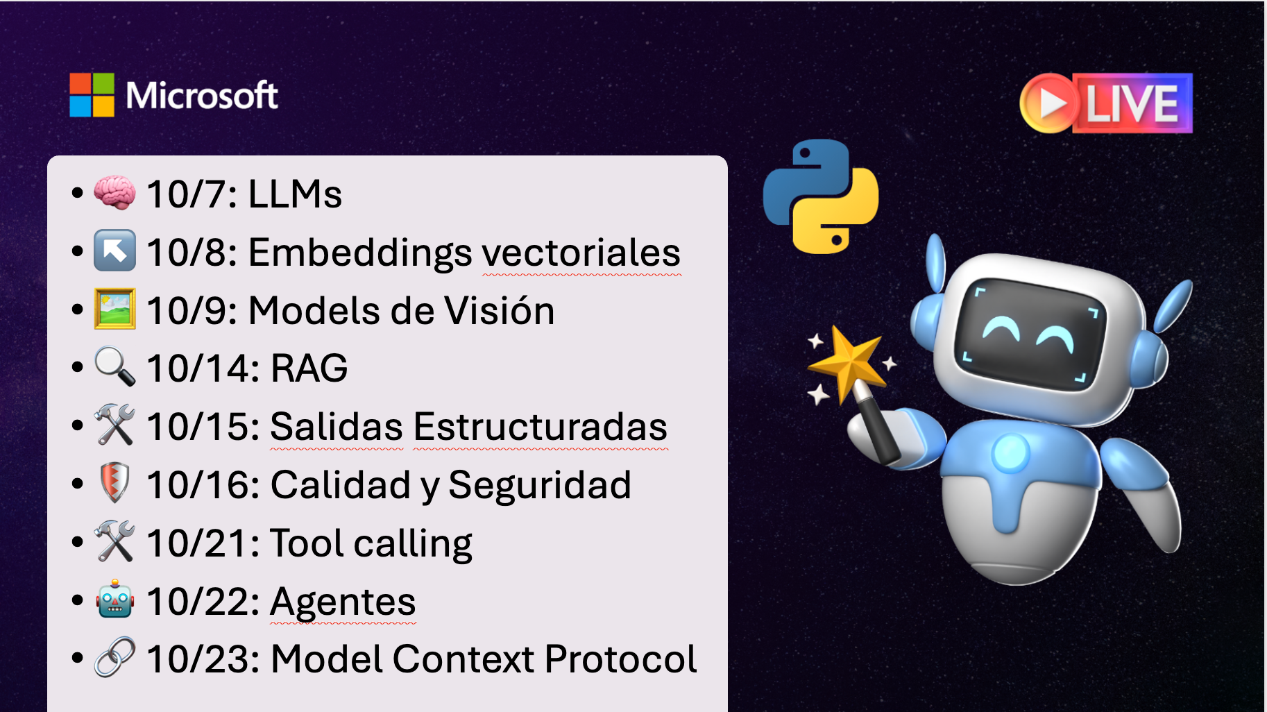Durante la serie presentamos varios tipos de modelos, incluyendo LLMs, modelos de embeddings y modelos de visión. Profundizamos en técnicas populares como RAG, tool calling y salidas estructuradas. Evaluamos la calidad y seguridad de la IA mediante evaluaciones automatizadas y red-teaming. Finalmente, desarrollamos agentes de IA con frameworks populares de Python y exploramos el nuevo Model Context Protocol (MCP).