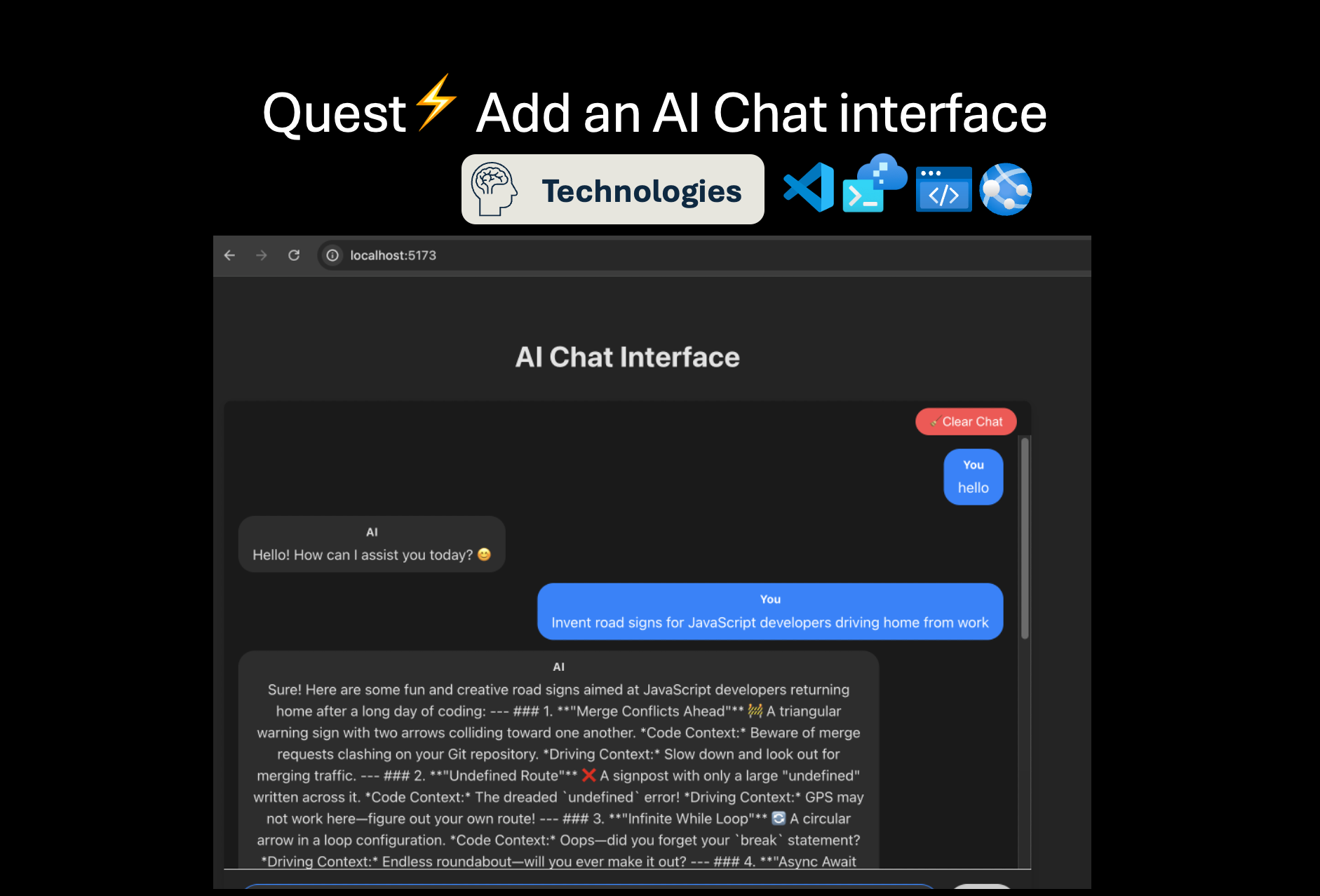 In this quest, you’ll give your Gen AI prototype a polished chat interface using Vite and Lit. Along the way, you’ll also manage application infrastructure with Bicep and Azure Developer CLI (azd), making your prototype more structured and ready for deployment.