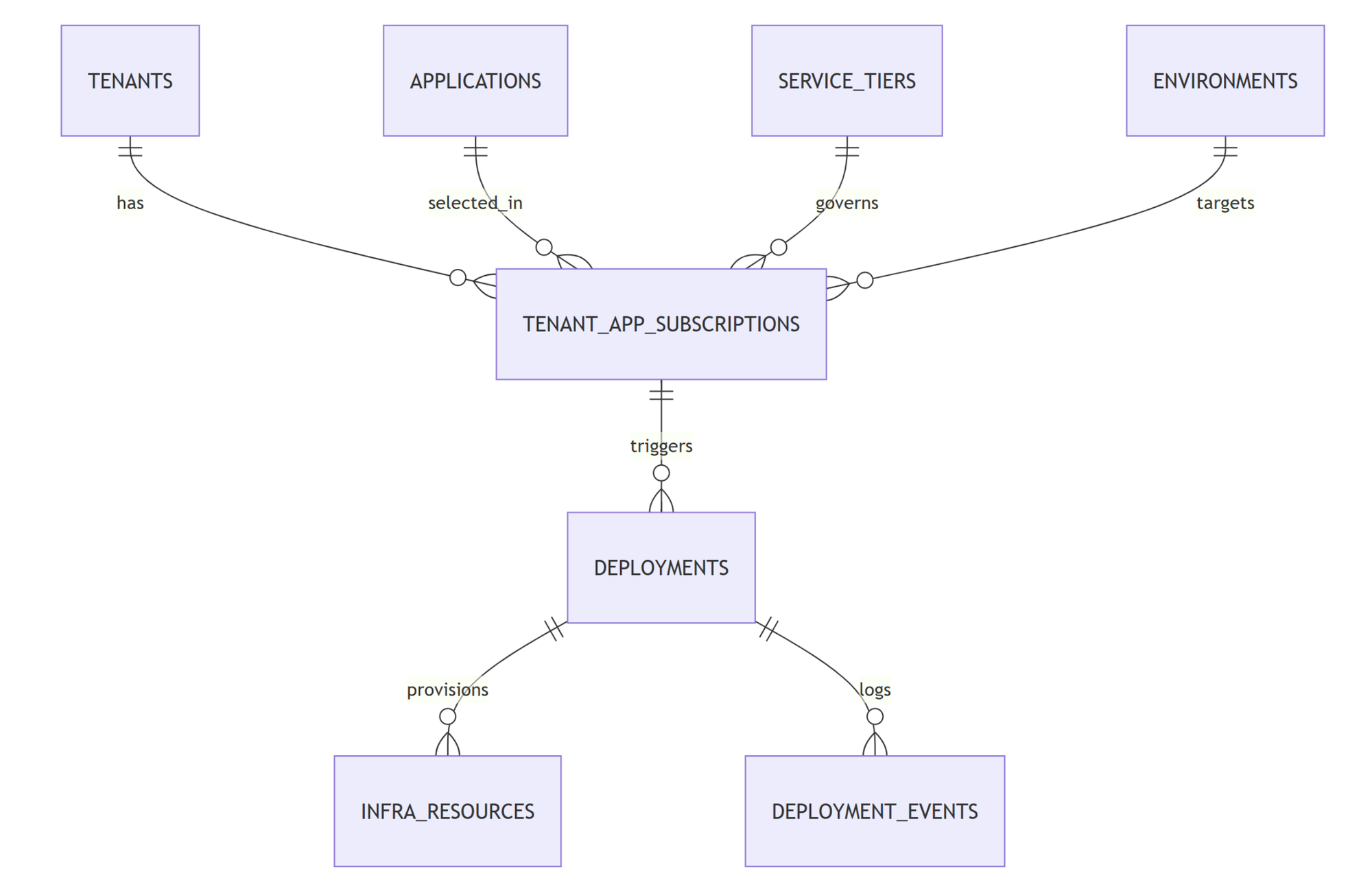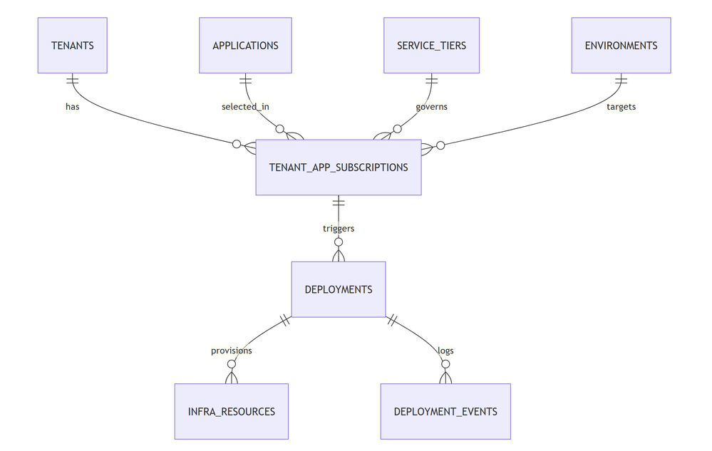 Design a relational schema for a multi-tenant onboarding flow where tenants select application, service tier, and environment, followed by deployment and infrastructure tracking. Include relationship rationale.