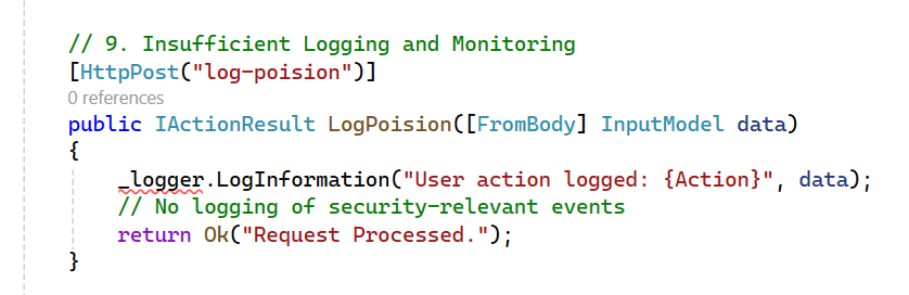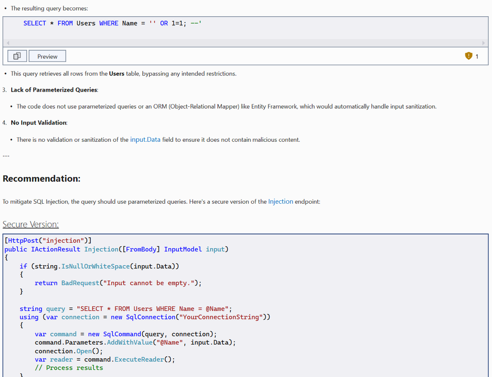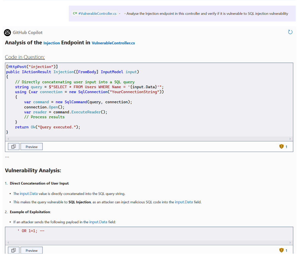 Copilot scans for dynamic SQL queries where user input is directly concatenated, flagging them as potential injection points.