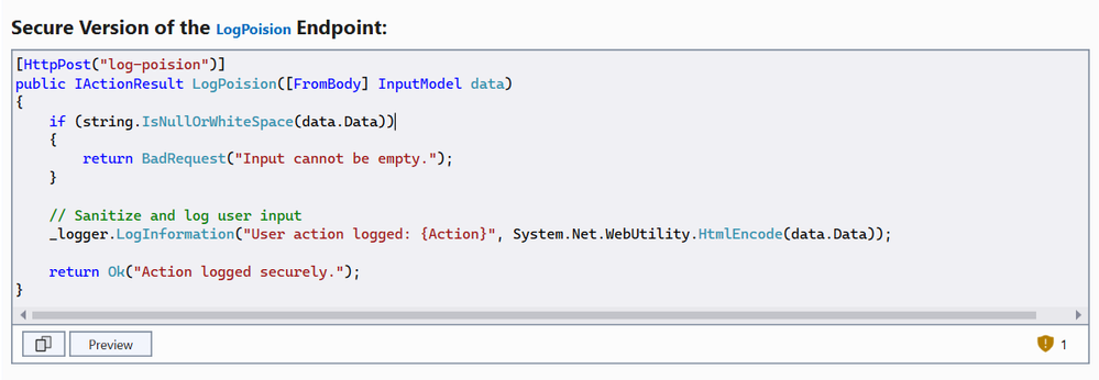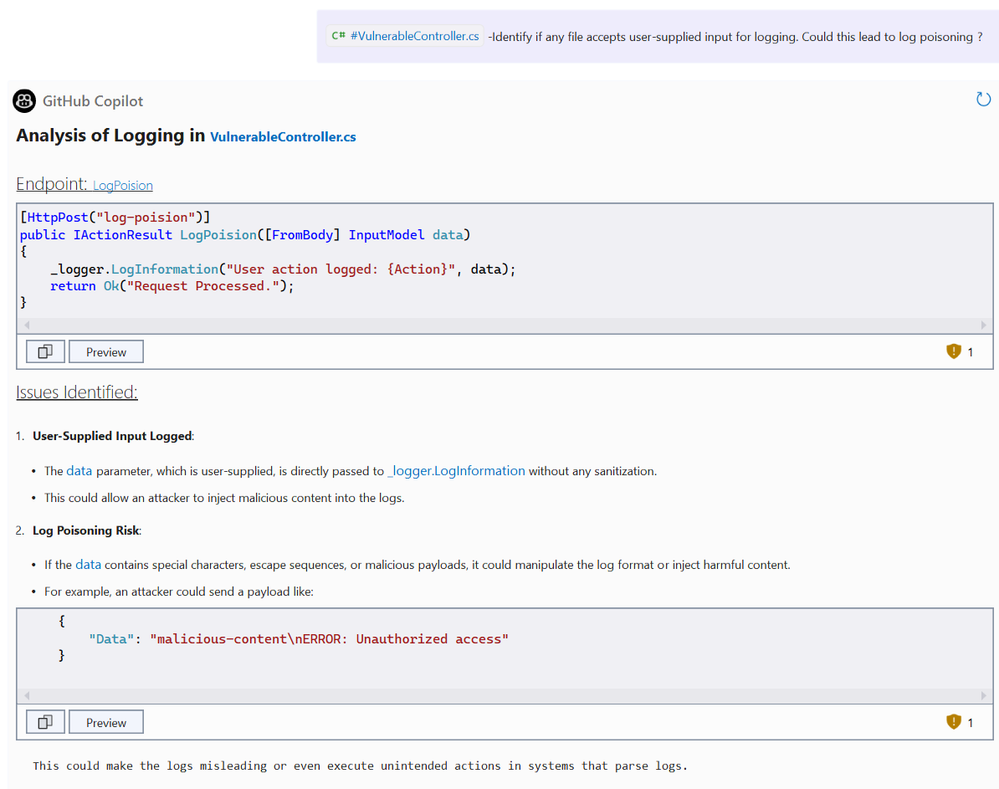 Copilot flags unsafe logging practices and recommends sanitizing inputs or using structured logging frameworks.