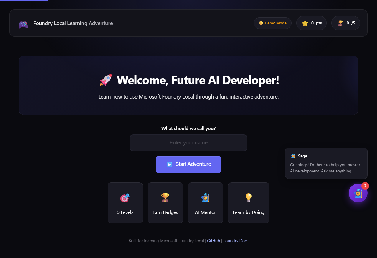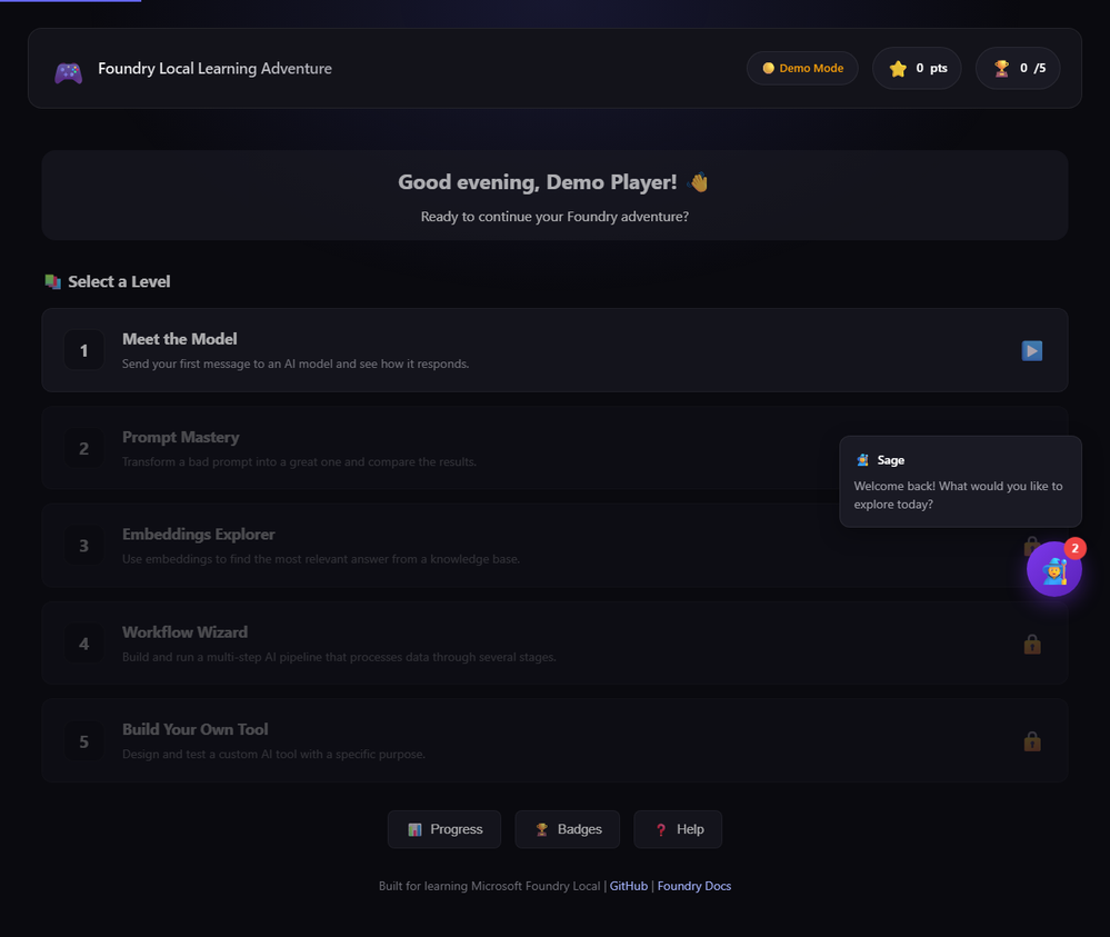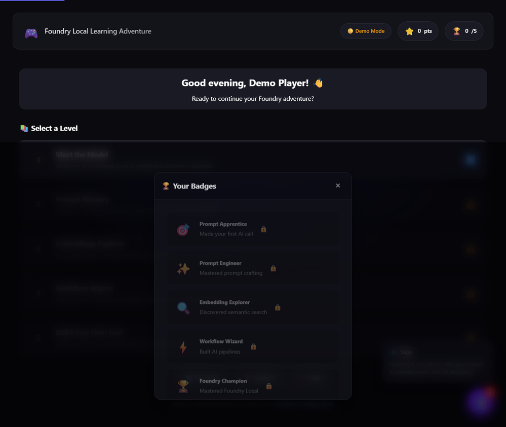 The web version prioritizes zero-friction onboarding. It's deployed to GitHub Pages and can also be opened locally via a simple HTTP server, no build step, no package managers. The game starts with simulated AI responses in demo mode, but crucially, it also supports real AI responses when Foundry Local is installed. The web version auto-discovers Foundry Local's dynamic port through a foundry-port.json file (written by the startup scripts) or by scanning common ports. Progress saves to localStorage, badges unlock as you complete challenges, and an AI-powered mentor named Sage guides you through a chat widget in the corner. This version is perfect for classrooms, conference demos, and learners who want to try before committing to a full CLI setup.