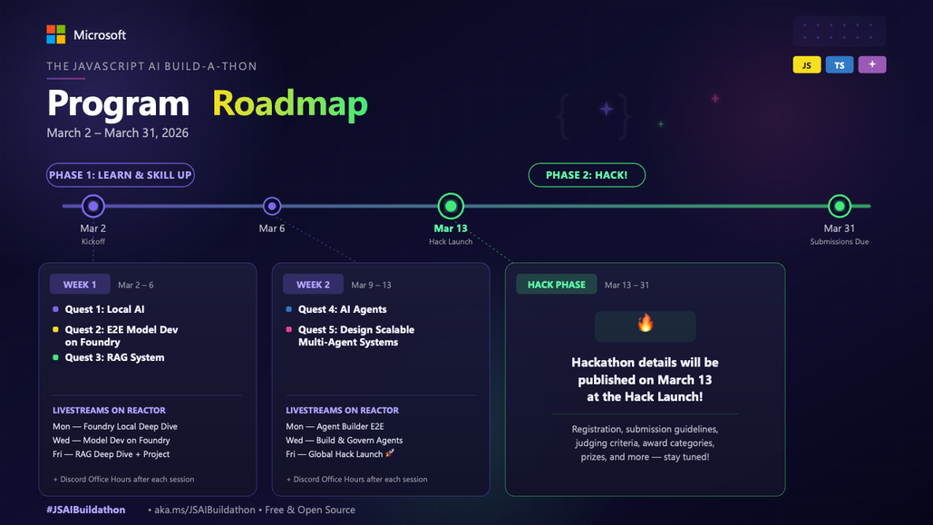 The JavaScript AI Build-a-thon is a free, hands-on program designed to close that gap. Over the course of four weeks (March 2 - March 31, 2026), you'll move from running AI 100% on-device (Local AI), to designing multi-service, multi-agentic systems, all in JavaScript/ TypeScript and using tools you are already familiar with.