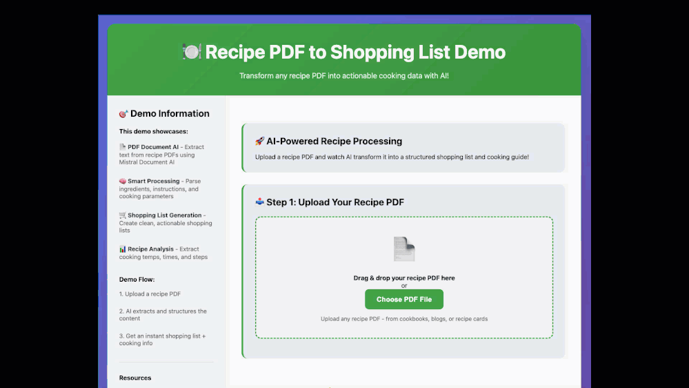 With your data in structured JSON, you can now build applications or agents that leverage this knowledge. Here is an example of a simple app (Web Components) that implements the above end-to-end flow, allowing users to upload recipe documents and see extracted structured data and shopping lists.