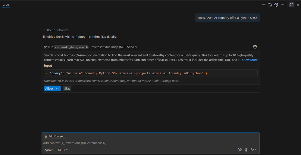 - Ask Away: Try a question like, “Does Azure AI Foundry offer a Python SDK?” Copilot will route your query to the MCP server and return grounded answers from Microsoft Learn Docs—so you know you’re getting the real deal. You'll see that Copilot will ask permission to use the 'microsoft_docs_search' tool offered by the MCP server. Click on 'Allow' to let it proceed.