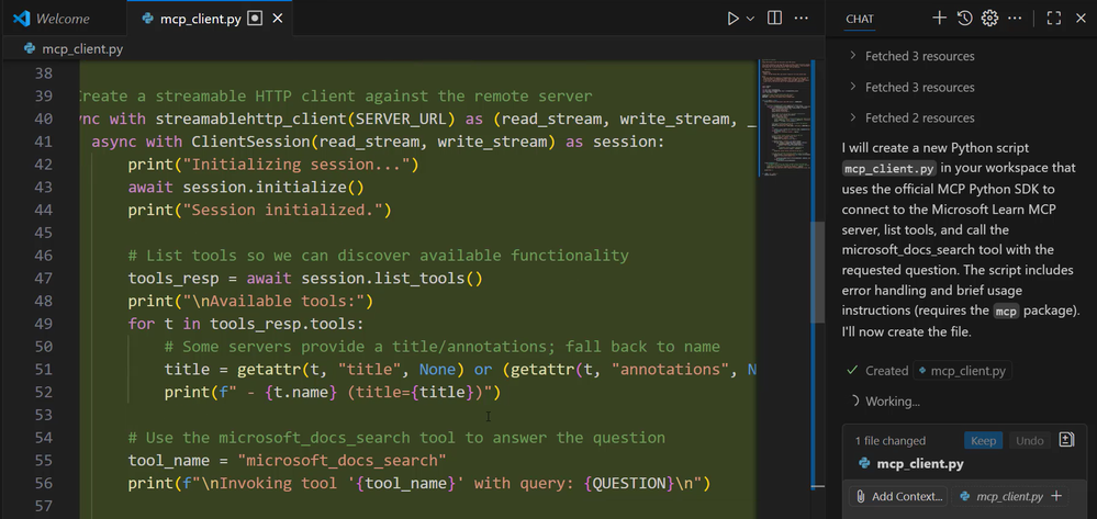 Want even more control? You can build a custom Python client to invoke the Microsoft Docs MCP server directly via streamable http. This approach gives you maximum flexibility and lets you overcome product-specific constraints.