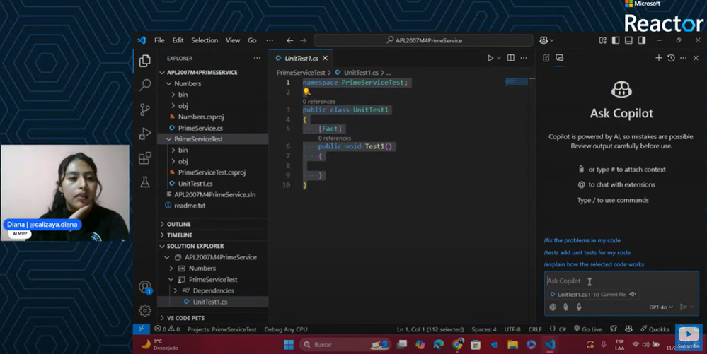 En la tercera sesión del GitHub Copilot Bootcamp LATAM, Diana Calizaya, Microsoft MVP de Bolivia, presentó cómo utilizar GitHub Copilot para crear pruebas unitarias y documentación de código. Este taller práctico mostró cómo Copilot puede simplificar tareas repetitivas y mejorar la eficiencia de los desarrolladores.