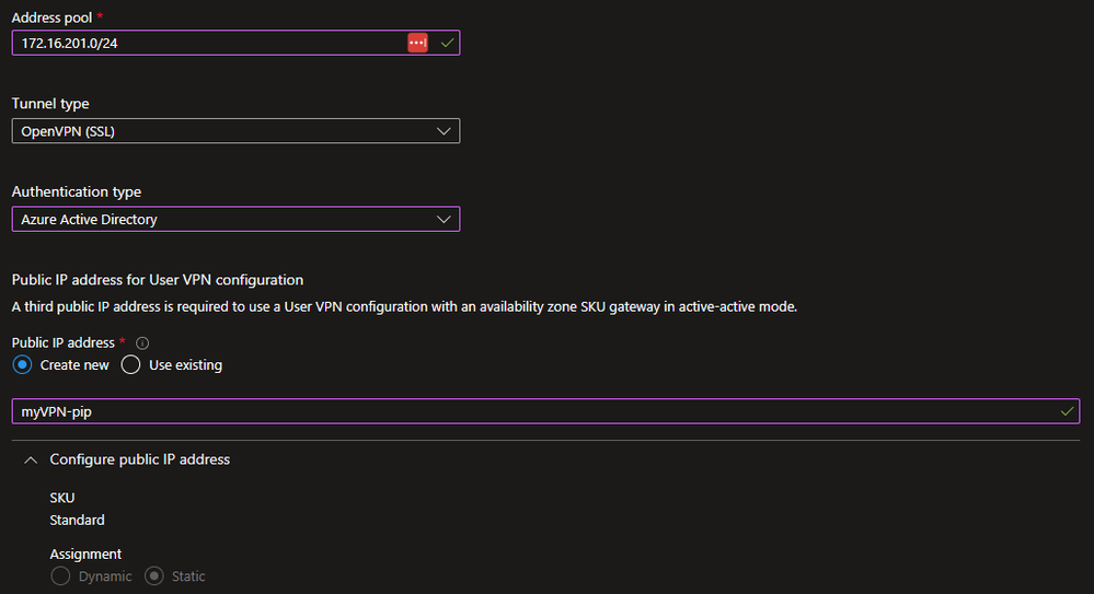 I chose the VpnGw1 SKU for my Virtual Network Gateway (VNG) as this is just for testing and I do not require a great deal of bandwidth or number of connections, but you can size your VNG to your needs.