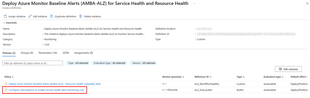 The new built-in policy, called "Configure subscriptions to enable service health alert monitoring rule", has been added to the new "Deploy Azure Monitor Baseline Alerts (AMBA-ALZ) for Service Health and Resource Health" initiative together with the previous Resource Health custom policy