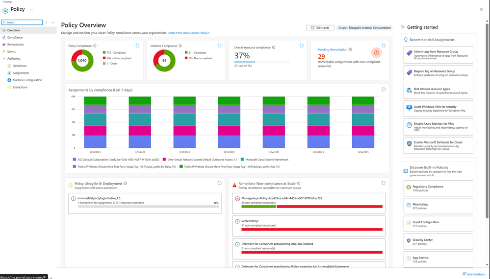As the policy framework has expanded, the focus of your policy management has expanded beyond just compliance, to other aspects of the policy deployment lifecycle, including exemptions & remediations. We also know that one size does not fit all, so we are excited to release a new Azure policy UX landing page that provides a refreshed view on compliance, policy status, and will showcase how to get started using new primitives & releases. Try it out and let us know what you think!