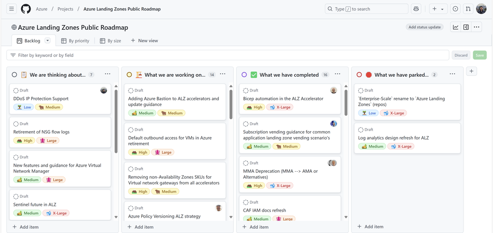 We also encourage you to share your thoughts, ideas and suggestions for work items we have on our roadmap using the discussions tab of the repository. This will help us prioritize features and capabilities we bring into ALZ.