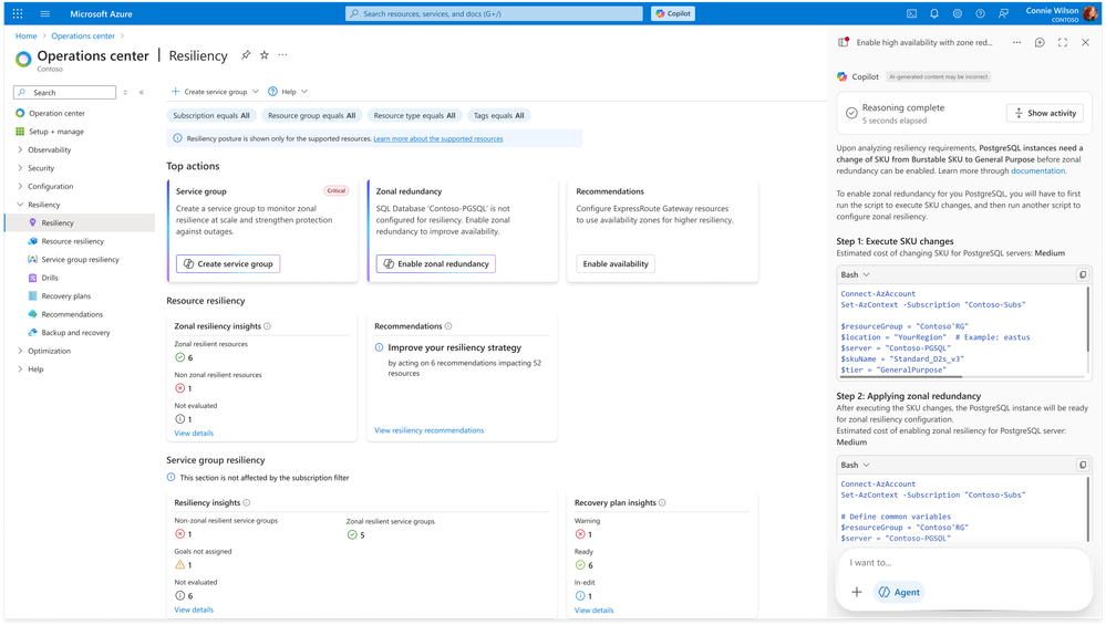 Leverage at-scale views across Resources and Service Groups to uncover resiliency blind spots and prioritize remediation. Set resilience targets for your key workloads and invoke the resiliency agent from the operations center in Azure to proactively find resources (like virtual networks or firewalls) that are deployed in only one availability zone and could become single points of failure. Once identified the agent will highlight which resources aren’t zone-resilient and the risks they pose, such as potential downtime or IP address changes during a zone failure, enabling you to prioritize the most crucial gaps first. Then with a click, the agent will generate ready-to-run scripts (or commands) to distribute those resources across zones to address configuration drift and strengthen architecture. This guided automation ensures that even if an entire Azure zone goes down, your application stays up.