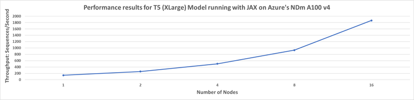 The results highlight good scaling from 1 to 16 nodes on both the Large and XLarge T5 models running with JAX on Azure. The Large T5 model has a scaling efficiency of 84% at 16 nodes (128 GPUs) while the XL T5 model has a scaling efficiency of 82% at 16 nodes (128 GPUs). The throughput is within 5% as compared to the NVIDIA DGX A100 data reported here. Customers can now use the JAX framework on Azure when training Large Language Models (LLMs) with solid scaling performance.