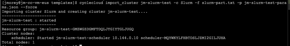 cyclecloud import_cluster jm-slurm-test -c Slurm -f slurm-part.txt -p jm-slurm-test-params.json --force