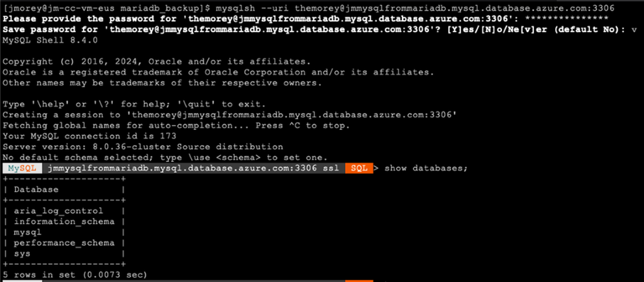 mysqlsh --uri ${mysqldbusername}@${mariadbname}.mysqldb.database.azure.com:3306