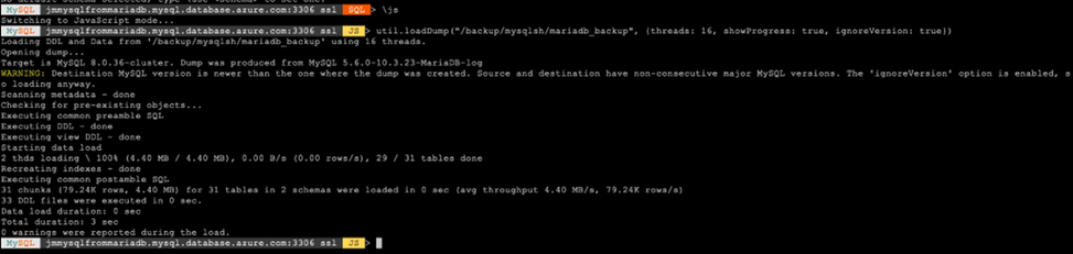util.loadDump("/backup/mysqlsh/mariadb_backup", {threads: 16, showProgress: true, ignoreVersion: true})
