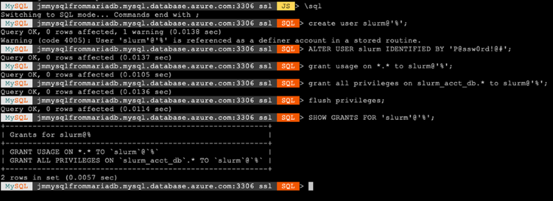 To fix this, we need to switch back to SQL mode, create a new user account with the same name and password as the SLURM user in MariaDB, and grant privileges: