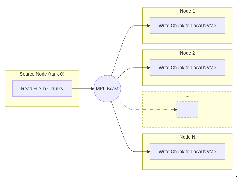 The source node reads the file in chunks and streams each chunk via MPI_Bcast. Destination nodes write each chunk to local storage immediately upon receipt. This streaming approach means the entire file never needs to fit in memory — only a small buffer is required.