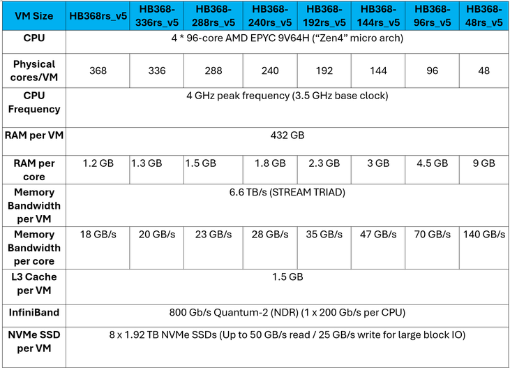 - Up to 368 physical cores per VM (user configurable) with custom AMD EPYC CPUs, Zen4 microarchitecture (SMT disabled)