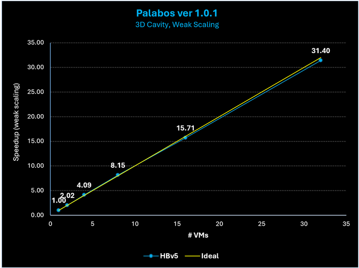 To illustrate weak scaling on HBv5 VMs, we ran Palabos with the same 3D cavity problem as shown earlier: