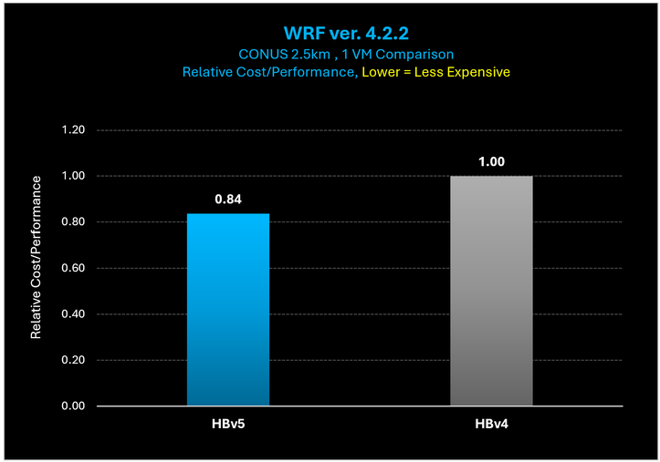 Figure 13: The cost to complete the WRF Conus 2.5KM case is just 84% of what it costs to complete the same case on HBv4.