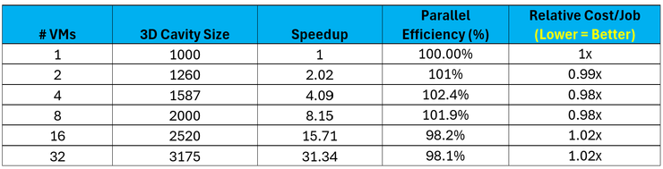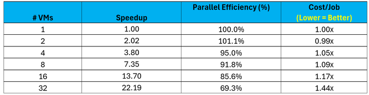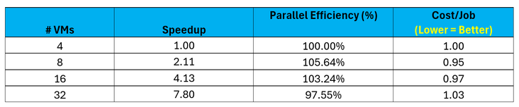As illustrated above, larger cases with significant compute requirements will continue to scale efficiently with larger amounts of HBv5 infrastructure. While MPI time remains relatively flat for this case (as is the case with the smaller STMV 20M case), the compute demands remain the dominant fraction of end-to-end wall clock time. As such, HBv5 scales these problems with very high levels of efficiency and in doing so job costs to the user remain flat despite up to 8x as many VMs being leveraged compared to the four (4) VM baseline.