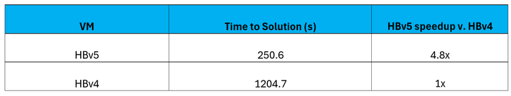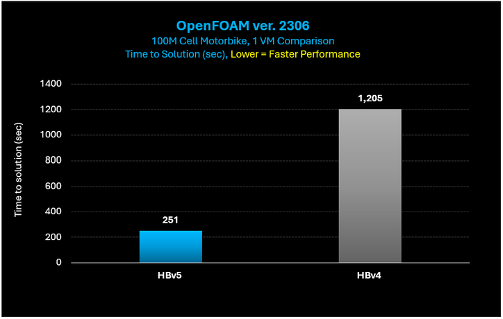 Figure 4: HBv5 v. HBv4 on on OpenFOAM with the Motorbike 100M cell case HBv5 VMs provide a 4.8x performance increase over HBv4 VMs.