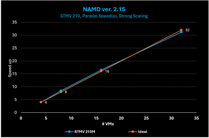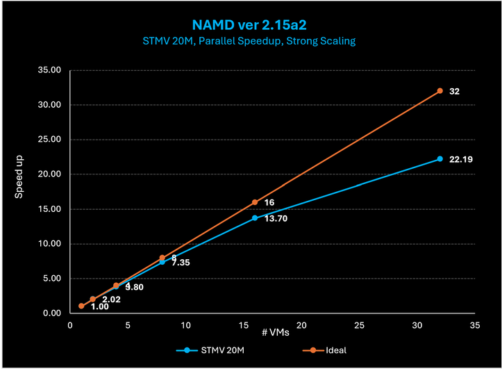 Figure 19: On NAMD with the STMV 210M cell case, HBv5 scales linearly out to 32 VMs (or more than 11,000 CPU cores).