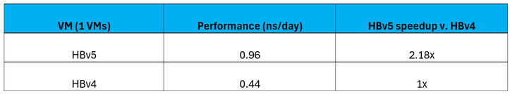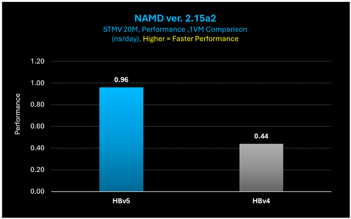 Figure 16: On NAMD, HBv5 VMs provide a 2.18x performance increase over HBv4 VMs.