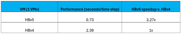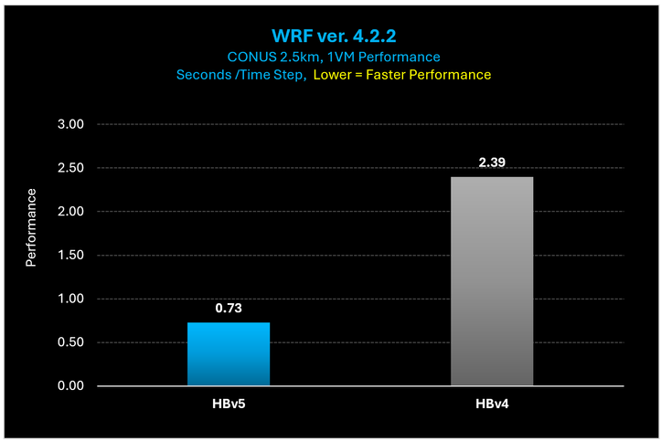 Figure 12: On WRF, HBv5 VMs provide a 3.27x performance increase over HBv4 VMs.