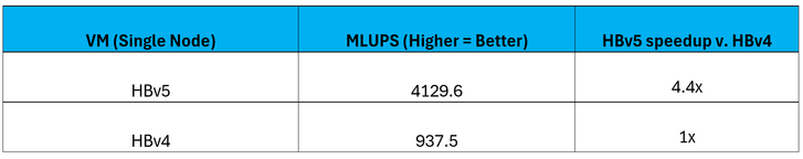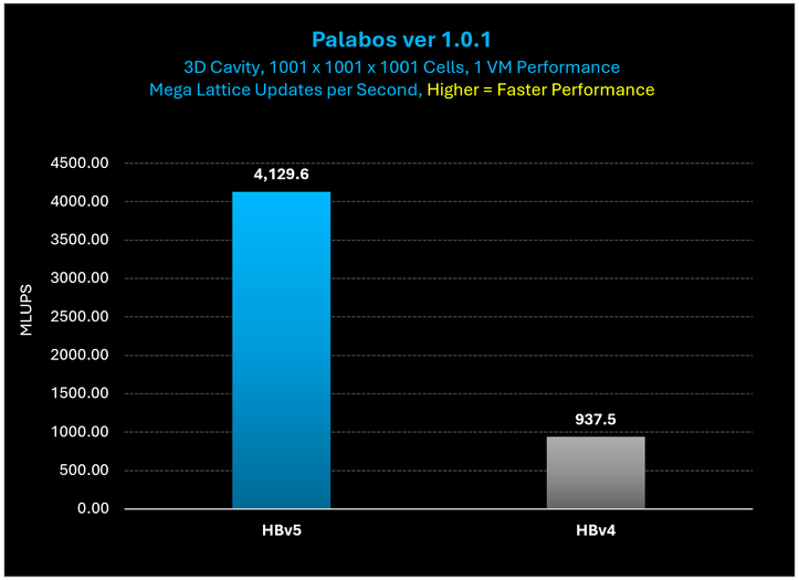 Figure 6: On Palabos, a Lattice Boltzmann solver using a streaming memory access pattern, HBv5 VMs provide a 4.4x performance increase over HBv4 VMs.