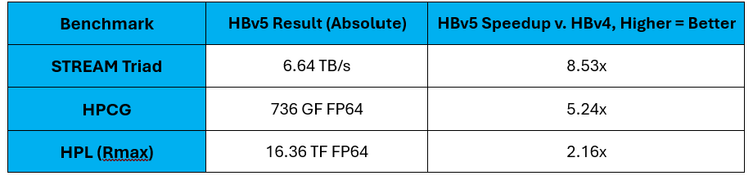 The highlight feature of HBv5 VMs is their use of high-bandwidth memory (HBM). HBv5 VMs utilize a custom AMD CPU that increases memory bandwidth by ~9x v. dual-socket 4th Gen EPYC (Zen4, “Genoa”) server platforms, and ~7x v. dual-socket EPYC (Zen5, “Turin”) server platforms, respectively. HBv5 delivers similar levels of memory bandwidth improvement compared to the highest end alternatives from the Intel Xeon and ARM CPU ecosystems.
