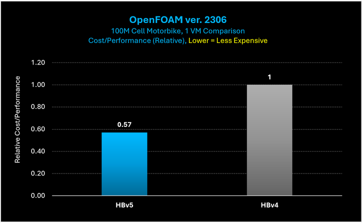 Figure 5: The cost to complete the OpenFOAM Motorbike 100M case is just 57% of what it costs to complete the same case on HBv4.