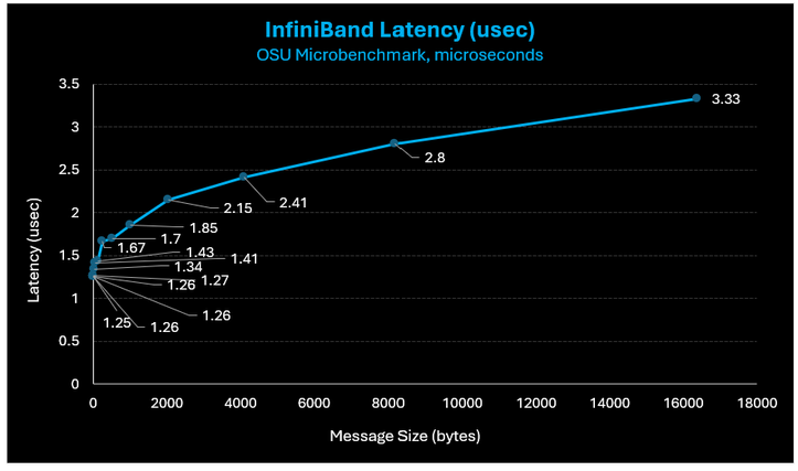 Figure 3: results measuring as low as 1.25 microsecond latencies among HBv5 VMs. Latencies experienced by users will depend on message sizes employed by applications.