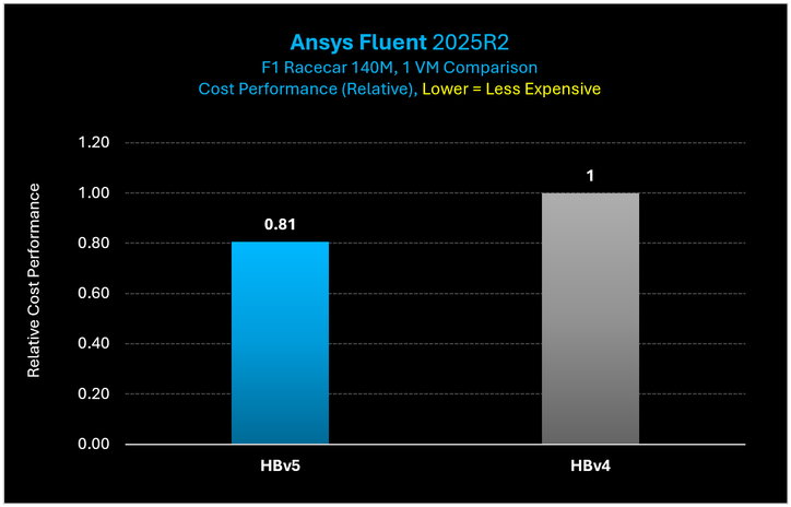 Figure 9: The cost to complete the ANSYS Fluent F1 racecar 140M case is just 81% of what it costs to complete the same case on HBv4.
