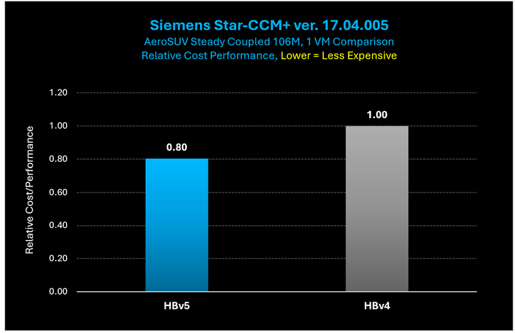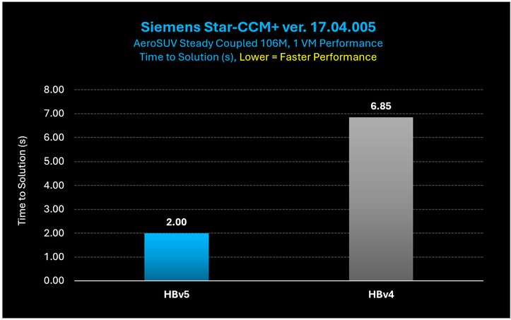 Figure 10: On Star-CCM+, HBv5 VMs provide a 3.4x performance increase over HBv4 VMs.