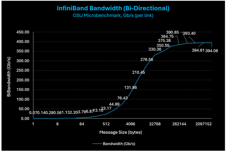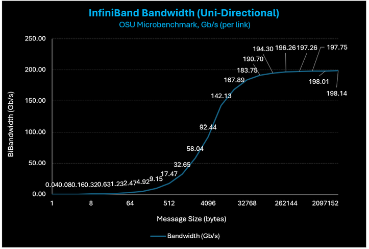 Note: all results below are for a single 200 Gb/s (uni-directional) link only. At a VM level, all bandwidth results below are 4x higher as there are four (4) InfiniBand links per HBv5 server.