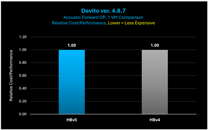 Figure 15: The cost to complete the Devito Acoustic Forward OP case is equivalent to what it costs to complete the same case on HBv4.